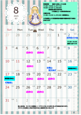 8月カレンダーとお盆期間中のメニュー