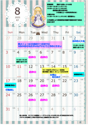 8月カレンダーとお盆期間中のメニュー